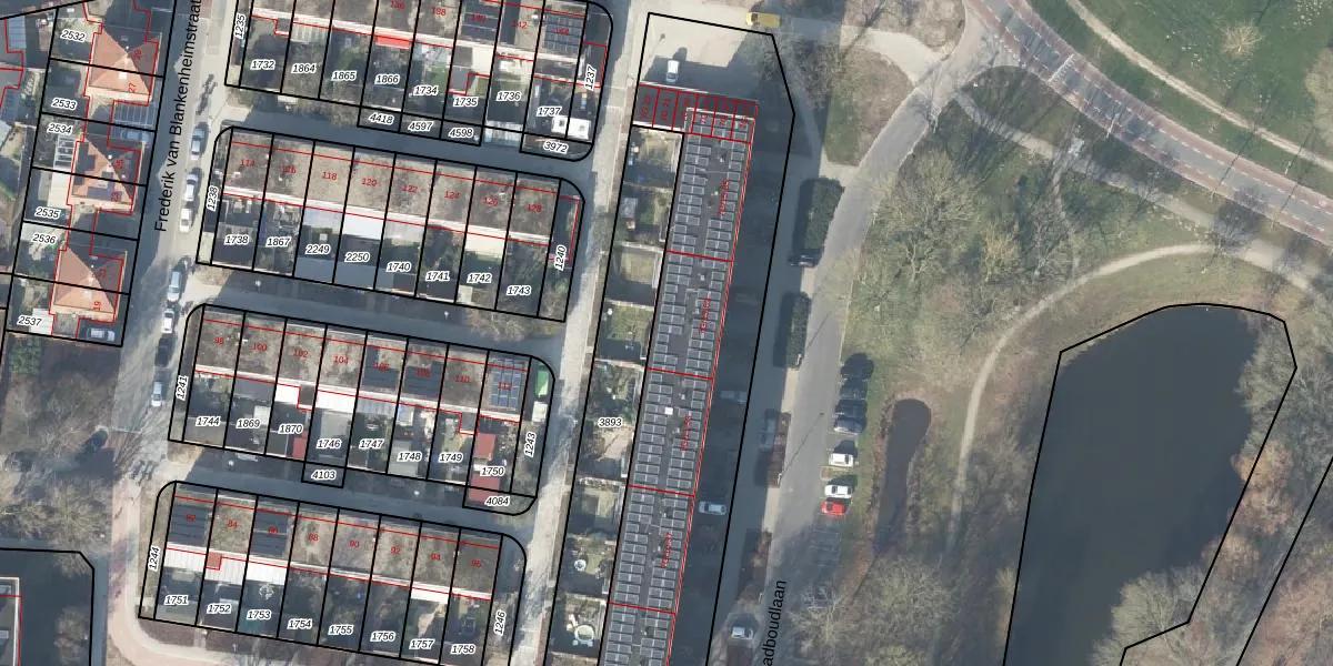 Het perceel waarop Radboudlaan 61 staat heeft een oppervlakte van 2025 m². Dit is een zeer groot perceel. De perceeloppervlakte wordt geregistreerd door het Kadaster. Gedetailleerde informatie over de maten van dit perceel kunt u vinden in het rapport Kadastrale kaart met maatvoering van Radboudlaan 61.