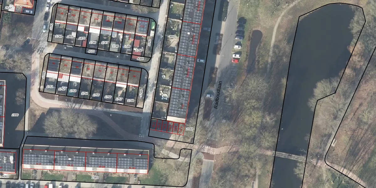 Het perceel waarop Radboudlaan 7-G-8 staat heeft een oppervlakte van 2025 m². Dit is een zeer groot perceel. De perceeloppervlakte wordt geregistreerd door het Kadaster. Gedetailleerde informatie over de maten van dit perceel kunt u vinden in het rapport Kadastrale kaart met maatvoering van Radboudlaan 7-G-8.