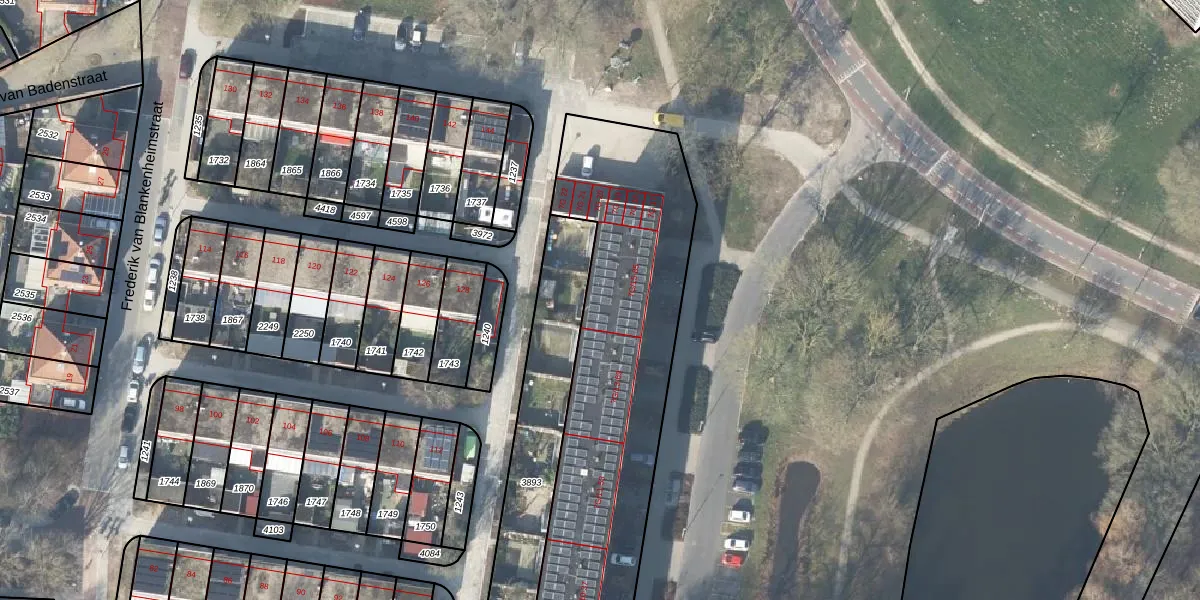 Het perceel waarop Radboudlaan 77 staat heeft een oppervlakte van 2025 m². Dit is een zeer groot perceel. De perceeloppervlakte wordt geregistreerd door het Kadaster. Gedetailleerde informatie over de maten van dit perceel kunt u vinden in het rapport Kadastrale kaart met maatvoering van Radboudlaan 77.