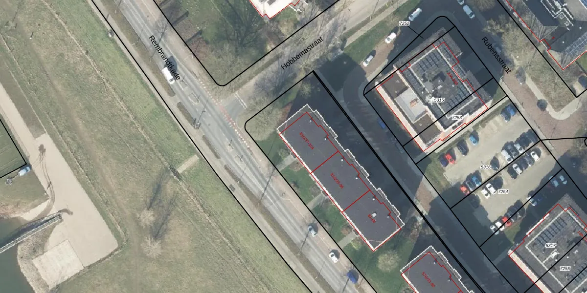 Het perceel waarop Rembrandtkade 104 staat heeft een oppervlakte van 5734 m². Dit is een zeer groot perceel. De perceeloppervlakte wordt geregistreerd door het Kadaster. Gedetailleerde informatie over de maten van dit perceel kunt u vinden in het rapport Kadastrale kaart met maatvoering van Rembrandtkade 104.