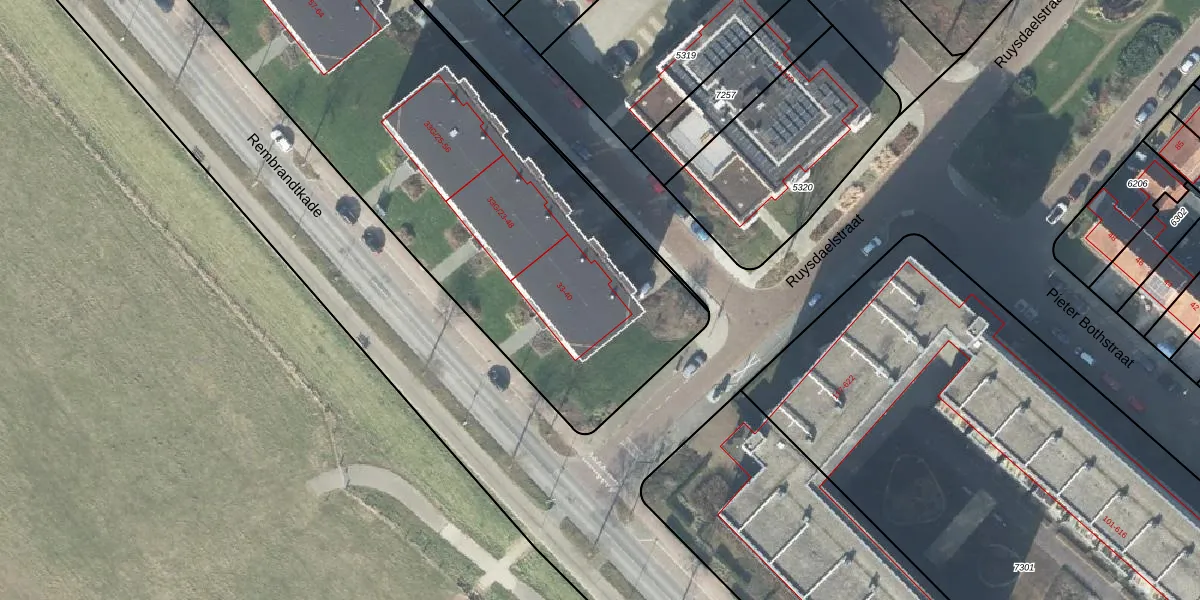 Het perceel waarop Rembrandtkade 35 staat heeft een oppervlakte van 5734 m². Dit is een zeer groot perceel. De perceeloppervlakte wordt geregistreerd door het Kadaster. Gedetailleerde informatie over de maten van dit perceel kunt u vinden in het rapport Kadastrale kaart met maatvoering van Rembrandtkade 35.