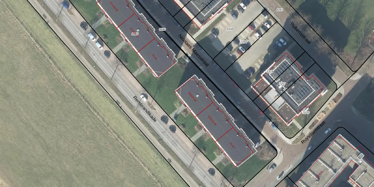 Het perceel waarop Rembrandtkade 55 staat heeft een oppervlakte van 5734 m². Dit is een zeer groot perceel. De perceeloppervlakte wordt geregistreerd door het Kadaster. Gedetailleerde informatie over de maten van dit perceel kunt u vinden in het rapport Kadastrale kaart met maatvoering van Rembrandtkade 55.