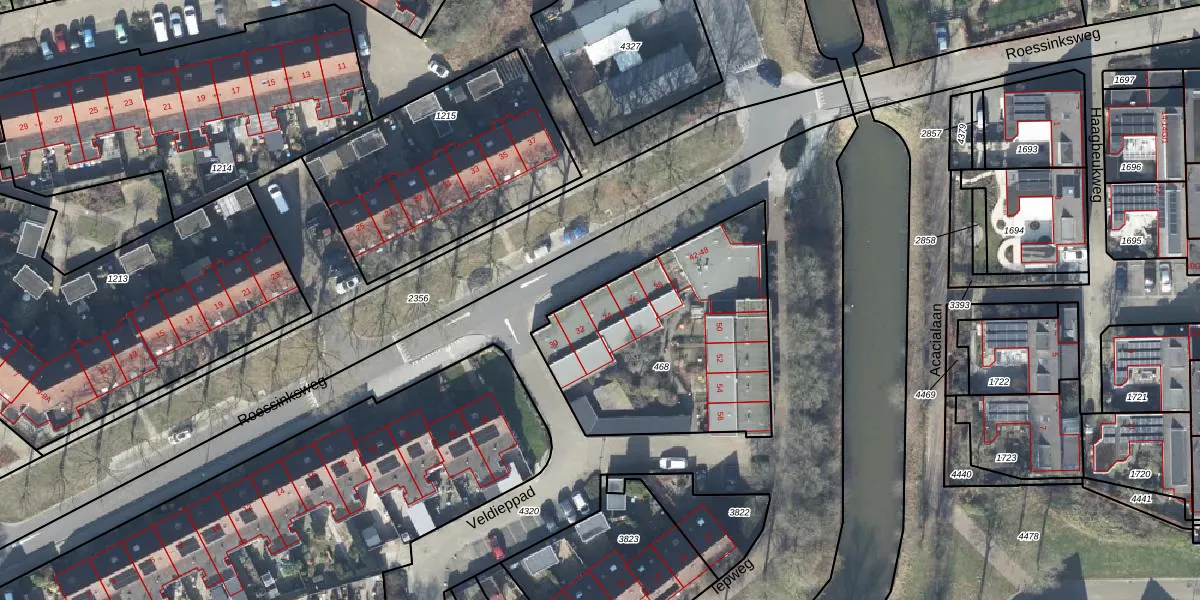 Het perceel waarop Roessinksweg 34 staat heeft een oppervlakte van 1065 m². Dit is een zeer groot perceel. De perceeloppervlakte wordt geregistreerd door het Kadaster. Gedetailleerde informatie over de maten van dit perceel kunt u vinden in het rapport Kadastrale kaart met maatvoering van Roessinksweg 34.