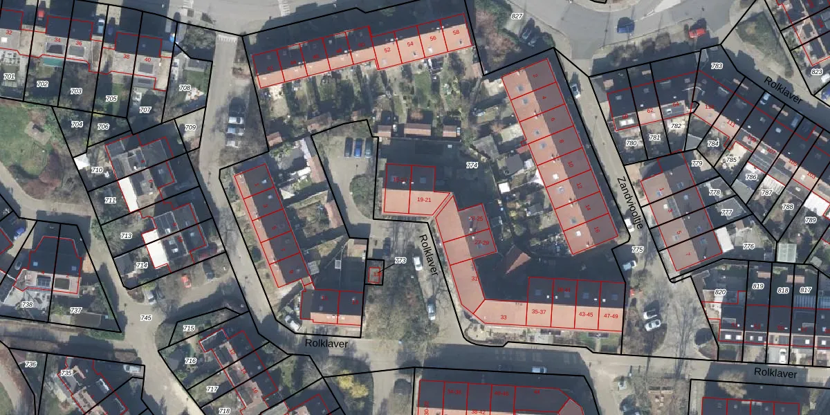 Het perceel waarop Rolklaver 19 staat heeft een oppervlakte van 5497 m². Dit is een zeer groot perceel. De perceeloppervlakte wordt geregistreerd door het Kadaster. Gedetailleerde informatie over de maten van dit perceel kunt u vinden in het rapport Kadastrale kaart met maatvoering van Rolklaver 19.