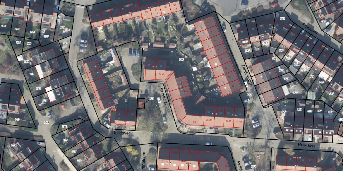 Het perceel waarop Rolklaver 23 staat heeft een oppervlakte van 5497 m². Dit is een zeer groot perceel. De perceeloppervlakte wordt geregistreerd door het Kadaster. Gedetailleerde informatie over de maten van dit perceel kunt u vinden in het rapport Kadastrale kaart met maatvoering van Rolklaver 23.