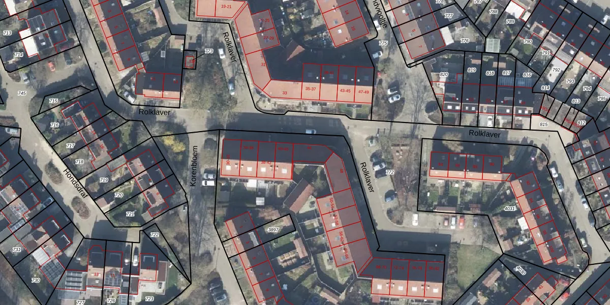Het perceel waarop Rolklaver 44 staat heeft een oppervlakte van 5022 m². Dit is een zeer groot perceel. De perceeloppervlakte wordt geregistreerd door het Kadaster. Gedetailleerde informatie over de maten van dit perceel kunt u vinden in het rapport Kadastrale kaart met maatvoering van Rolklaver 44.