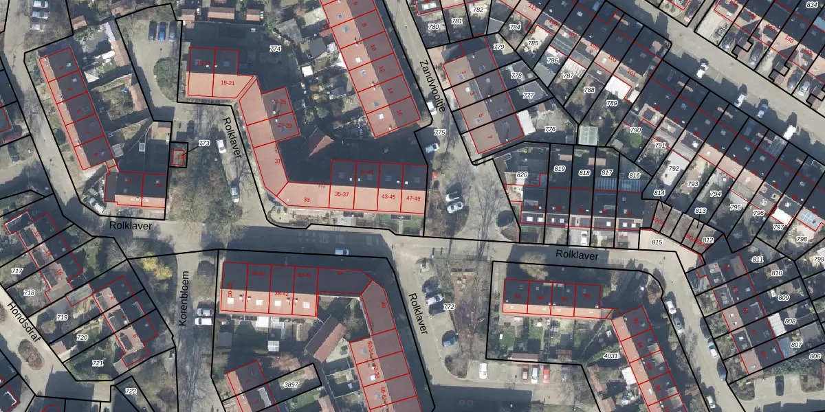 Het perceel waarop Rolklaver 47 staat heeft een oppervlakte van 5497 m². Dit is een zeer groot perceel. De perceeloppervlakte wordt geregistreerd door het Kadaster. Gedetailleerde informatie over de maten van dit perceel kunt u vinden in het rapport Kadastrale kaart met maatvoering van Rolklaver 47.