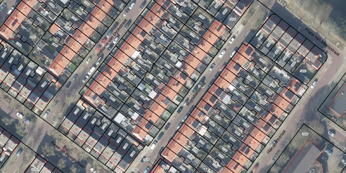 Het perceel waarop Ruysdaelstraat 16 staat heeft een oppervlakte van 145 m². Dit is een middelgroot perceel. De perceeloppervlakte wordt geregistreerd door het Kadaster. Gedetailleerde informatie over de maten van dit perceel kunt u vinden in het rapport Kadastrale kaart met maatvoering van Ruysdaelstraat 16.