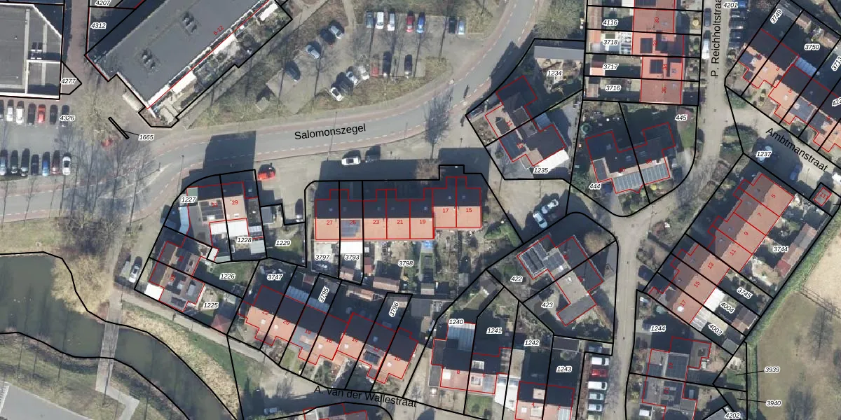 Het perceel waarop Salomonszegel 19 staat heeft een oppervlakte van 1387 m². Dit is een zeer groot perceel. De perceeloppervlakte wordt geregistreerd door het Kadaster. Gedetailleerde informatie over de maten van dit perceel kunt u vinden in het rapport Kadastrale kaart met maatvoering van Salomonszegel 19.