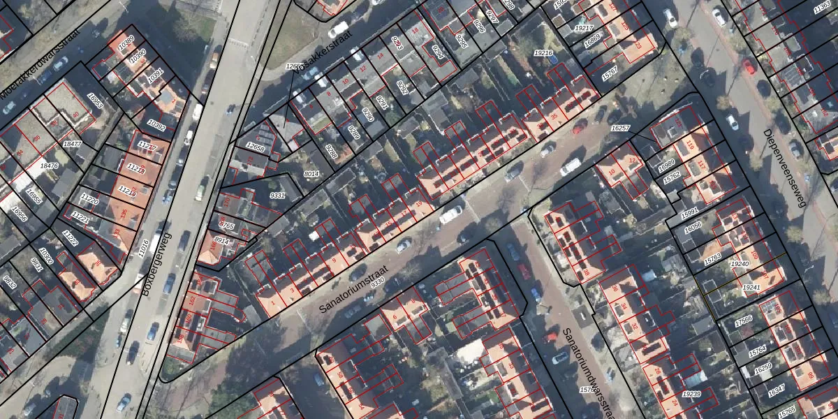 Het perceel waarop Sanatoriumstraat 19 staat heeft een oppervlakte van 2485 m². Dit is een zeer groot perceel. De perceeloppervlakte wordt geregistreerd door het Kadaster. Gedetailleerde informatie over de maten van dit perceel kunt u vinden in het rapport Kadastrale kaart met maatvoering van Sanatoriumstraat 19.