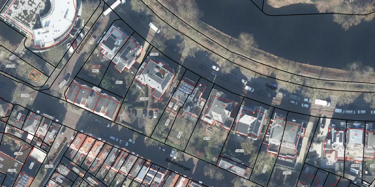 Het perceel waarop Singel 13-B staat heeft een oppervlakte van 320 m². Dit is een groot perceel. De perceeloppervlakte wordt geregistreerd door het Kadaster. Gedetailleerde informatie over de maten van dit perceel kunt u vinden in het rapport Kadastrale kaart met maatvoering van Singel 13-B.