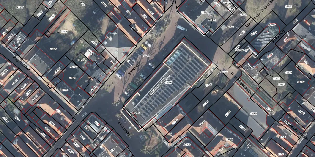 Het perceel waarop Stromarkt 18-A staat heeft een oppervlakte van 1546 m². Dit is een zeer groot perceel. De perceeloppervlakte wordt geregistreerd door het Kadaster. Gedetailleerde informatie over de maten van dit perceel kunt u vinden in het rapport Kadastrale kaart met maatvoering van Stromarkt 18-A.