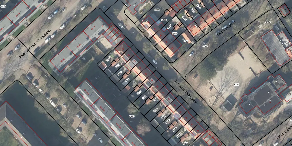 Het perceel waarop Tesselschadestraat 63 staat heeft een oppervlakte van 5752 m². Dit is een zeer groot perceel. De perceeloppervlakte wordt geregistreerd door het Kadaster. Gedetailleerde informatie over de maten van dit perceel kunt u vinden in het rapport Kadastrale kaart met maatvoering van Tesselschadestraat 63.