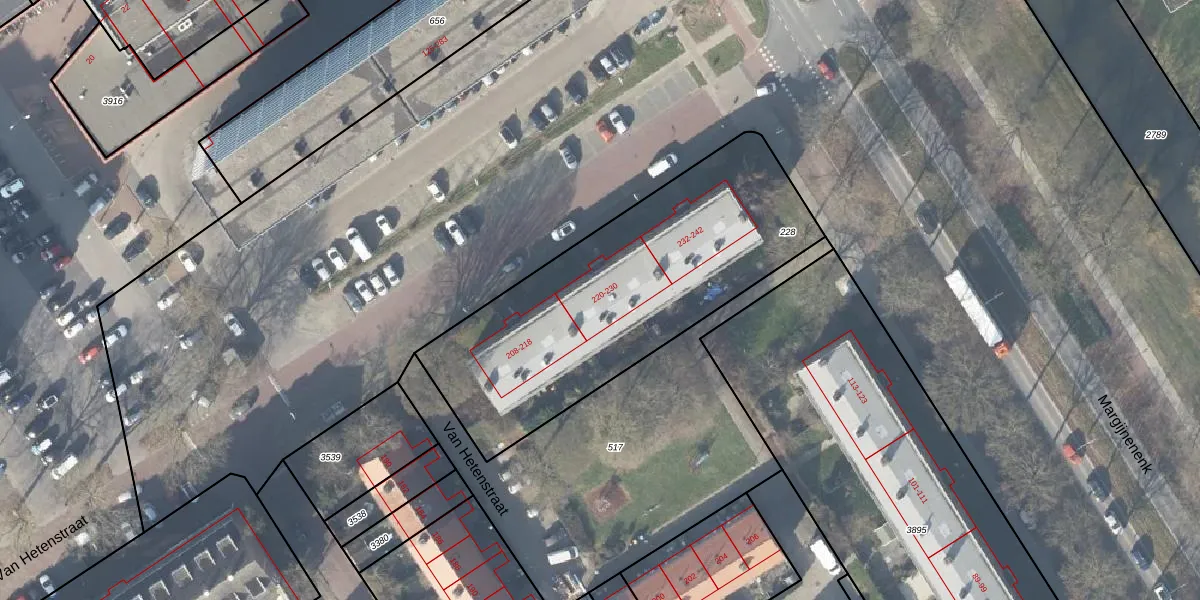 Het perceel waarop Van Hetenstraat 222 staat heeft een oppervlakte van 1496 m². Dit is een zeer groot perceel. De perceeloppervlakte wordt geregistreerd door het Kadaster. Gedetailleerde informatie over de maten van dit perceel kunt u vinden in het rapport Kadastrale kaart met maatvoering van Van Hetenstraat 222.
