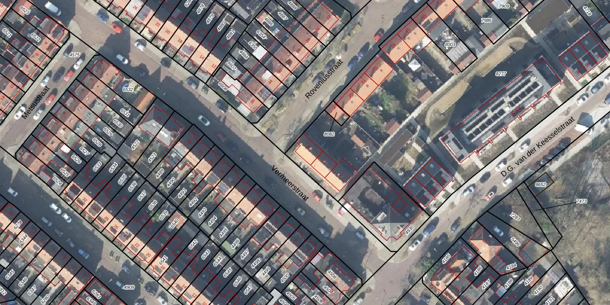 Het perceel waarop Vermeerstraat 8 staat heeft een oppervlakte van 4166 m². Dit is een zeer groot perceel. De perceeloppervlakte wordt geregistreerd door het Kadaster. Gedetailleerde informatie over de maten van dit perceel kunt u vinden in het rapport Kadastrale kaart met maatvoering van Vermeerstraat 8.