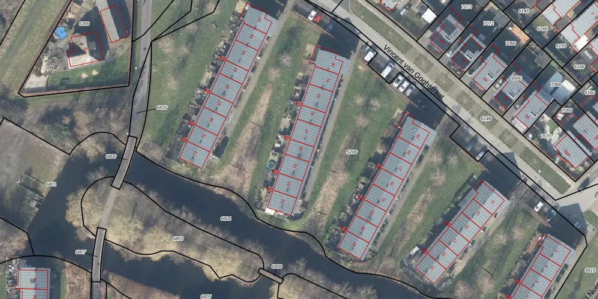 Het perceel waarop Vincent van Goghstraat 49 staat heeft een oppervlakte van 8902 m². Dit is een zeer groot perceel. De perceeloppervlakte wordt geregistreerd door het Kadaster. Gedetailleerde informatie over de maten van dit perceel kunt u vinden in het rapport Kadastrale kaart met maatvoering van Vincent van Goghstraat 49.