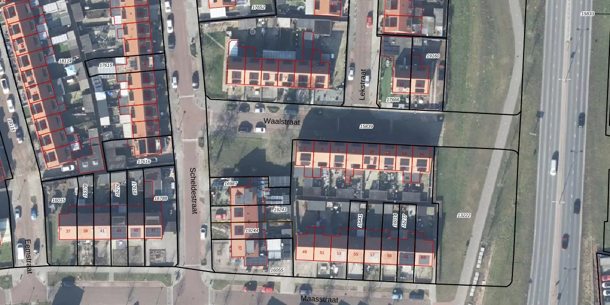 Het perceel waarop Waalstraat 2 staat heeft een oppervlakte van 1859 m². Dit is een zeer groot perceel. De perceeloppervlakte wordt geregistreerd door het Kadaster. Gedetailleerde informatie over de maten van dit perceel kunt u vinden in het rapport Kadastrale kaart met maatvoering van Waalstraat 2.