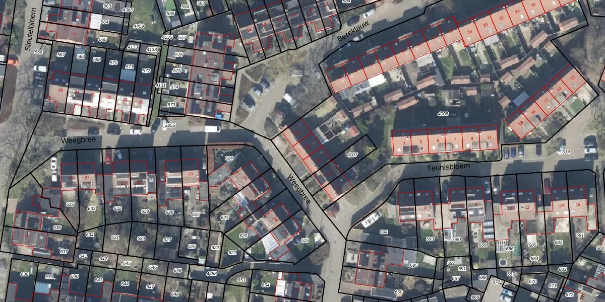 Het perceel waarop Weegbree 12 staat heeft een oppervlakte van 4603 m². Dit is een zeer groot perceel. De perceeloppervlakte wordt geregistreerd door het Kadaster. Gedetailleerde informatie over de maten van dit perceel kunt u vinden in het rapport Kadastrale kaart met maatvoering van Weegbree 12.