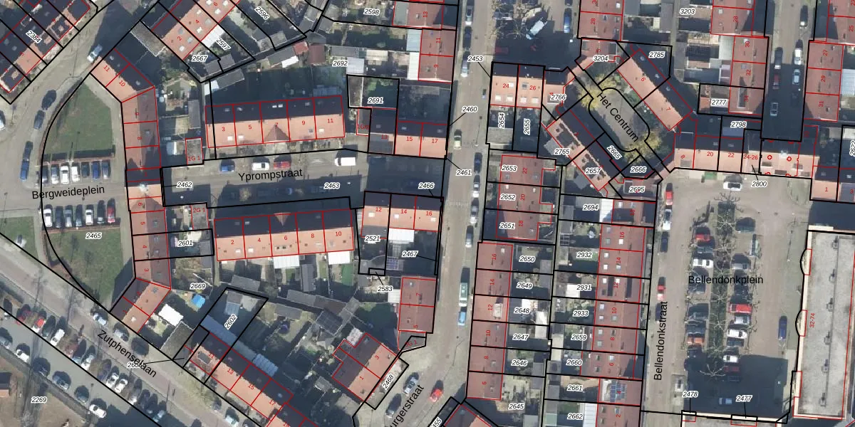 Het perceel waarop Yprompstraat 16 staat heeft een oppervlakte van 3531 m². Dit is een zeer groot perceel. De perceeloppervlakte wordt geregistreerd door het Kadaster. Gedetailleerde informatie over de maten van dit perceel kunt u vinden in het rapport Kadastrale kaart met maatvoering van Yprompstraat 16.