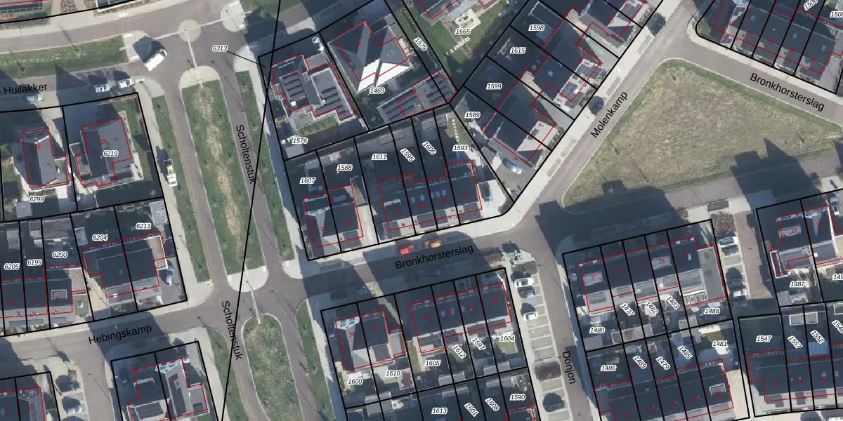 Bronkhorsterslag 30 is gelegen op kadastraal perceel DDM00N1595. Deze kadastrale aanduiding is uniek en wordt gebruikt door het Kadaster om eigendomsrechten en andere zakelijke rechten vast te leggen. Het perceel maakt onderdeel uit van de kadastrale gemeente Didam.
