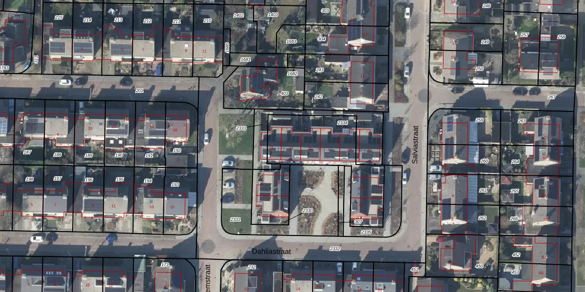 Het perceel waarop Dahliastraat 23 staat heeft een oppervlakte van 755 m². Dit is een groot perceel. De perceeloppervlakte wordt geregistreerd door het Kadaster. Gedetailleerde informatie over de maten van dit perceel kunt u vinden in het rapport Kadastrale kaart met maatvoering van Dahliastraat 23.