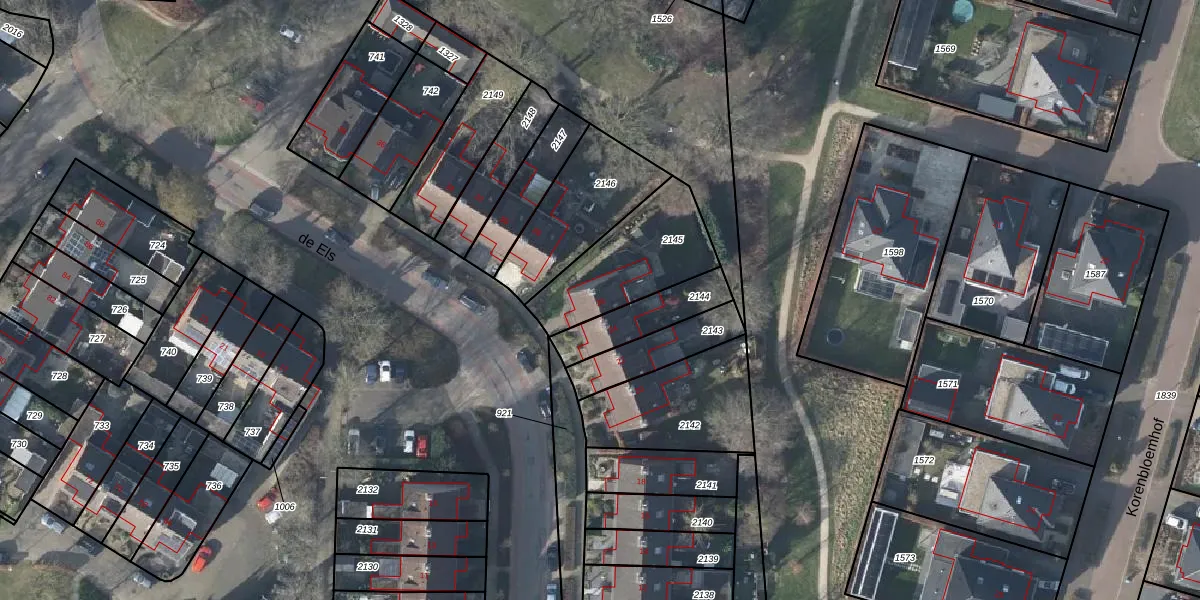 Het perceel waarop de Els 26 staat heeft een oppervlakte van 387 m². Dit is een groot perceel. De perceeloppervlakte wordt geregistreerd door het Kadaster. Gedetailleerde informatie over de maten van dit perceel kunt u vinden in het rapport Kadastrale kaart met maatvoering van de Els 26.