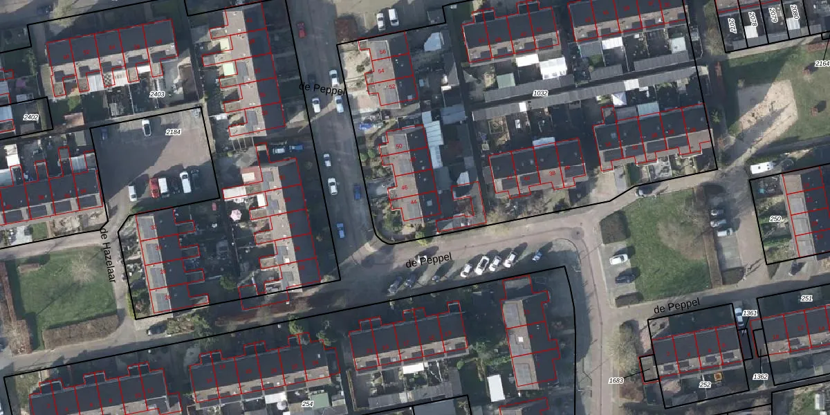de Peppel 44 is gelegen op kadastraal perceel DDM00M1032. Deze kadastrale aanduiding is uniek en wordt gebruikt door het Kadaster om eigendomsrechten en andere zakelijke rechten vast te leggen. Het perceel maakt onderdeel uit van de kadastrale gemeente Didam.