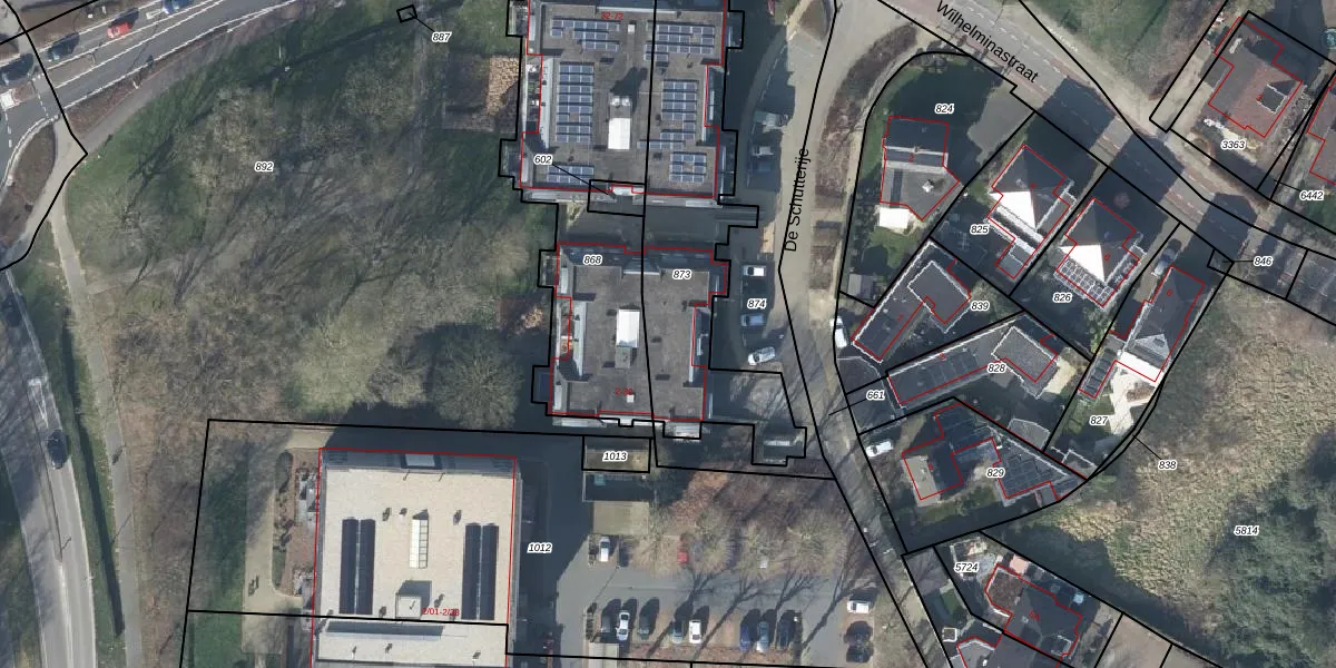 Het perceel waarop De Schutterije 24 staat heeft een oppervlakte van 878 m². Dit is een groot perceel. De perceeloppervlakte wordt geregistreerd door het Kadaster. Gedetailleerde informatie over de maten van dit perceel kunt u vinden in het rapport Kadastrale kaart met maatvoering van De Schutterije 24.