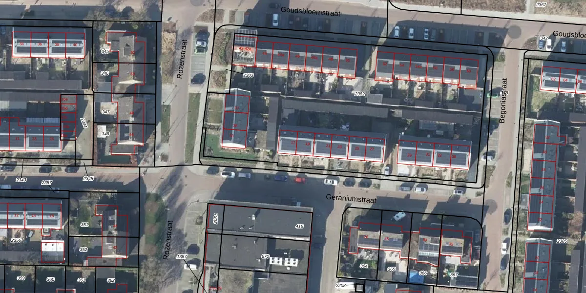 Het perceel waarop Geraniumstraat 17 staat heeft een oppervlakte van 3945 m². Dit is een zeer groot perceel. De perceeloppervlakte wordt geregistreerd door het Kadaster. Gedetailleerde informatie over de maten van dit perceel kunt u vinden in het rapport Kadastrale kaart met maatvoering van Geraniumstraat 17.