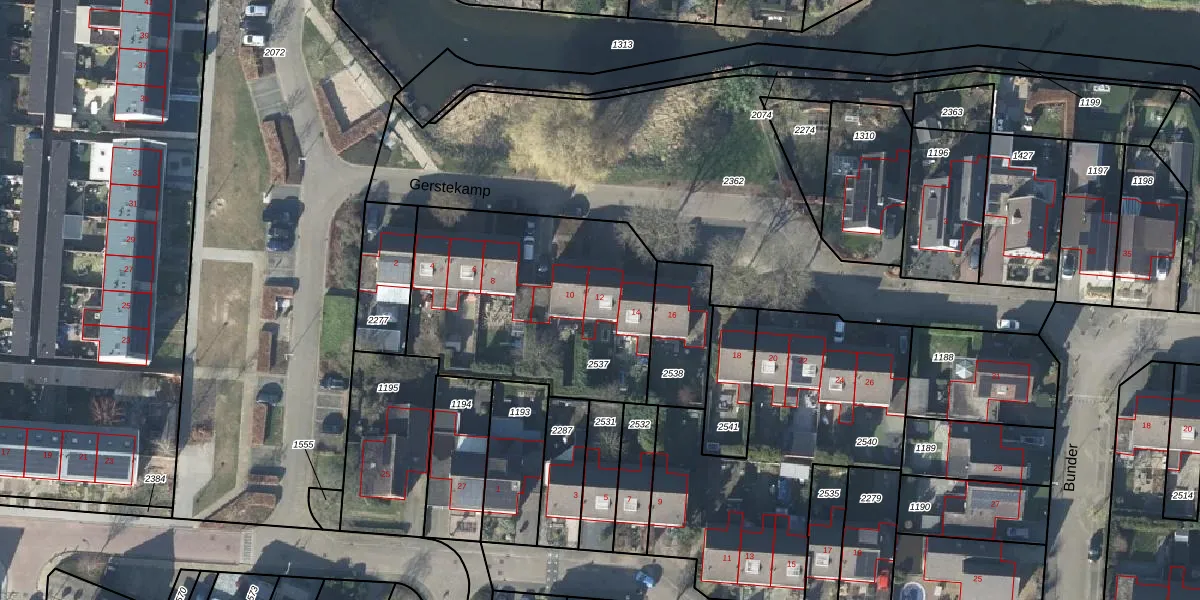 Het perceel waarop Gerstekamp 12 staat heeft een oppervlakte van 1135 m². Dit is een zeer groot perceel. De perceeloppervlakte wordt geregistreerd door het Kadaster. Gedetailleerde informatie over de maten van dit perceel kunt u vinden in het rapport Kadastrale kaart met maatvoering van Gerstekamp 12.
