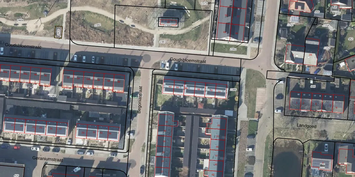 Het perceel waarop Goudsbloemstraat 64 staat heeft een oppervlakte van 7153 m². Dit is een zeer groot perceel. De perceeloppervlakte wordt geregistreerd door het Kadaster. Gedetailleerde informatie over de maten van dit perceel kunt u vinden in het rapport Kadastrale kaart met maatvoering van Goudsbloemstraat 64.