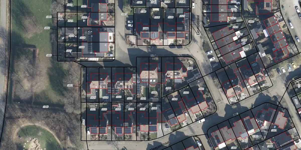 Gruttostraat 46 is gelegen op kadastraal perceel DDM00M1500. Deze kadastrale aanduiding is uniek en wordt gebruikt door het Kadaster om eigendomsrechten en andere zakelijke rechten vast te leggen. Het perceel maakt onderdeel uit van de kadastrale gemeente Didam.