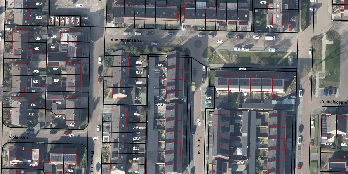 Het perceel waarop Irisstraat 15 staat heeft een oppervlakte van 1623 m². Dit is een zeer groot perceel. De perceeloppervlakte wordt geregistreerd door het Kadaster. Gedetailleerde informatie over de maten van dit perceel kunt u vinden in het rapport Kadastrale kaart met maatvoering van Irisstraat 15.