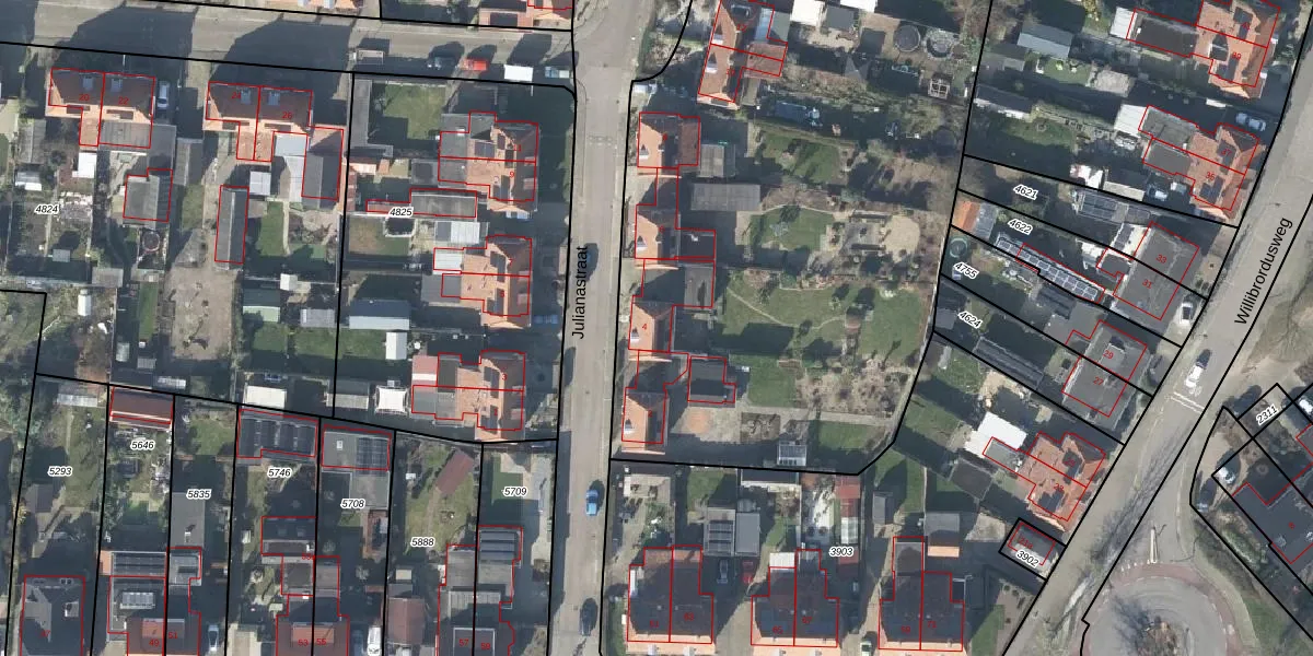 Het perceel waarop Julianastraat 4 staat heeft een oppervlakte van 8300 m². Dit is een zeer groot perceel. De perceeloppervlakte wordt geregistreerd door het Kadaster. Gedetailleerde informatie over de maten van dit perceel kunt u vinden in het rapport Kadastrale kaart met maatvoering van Julianastraat 4.