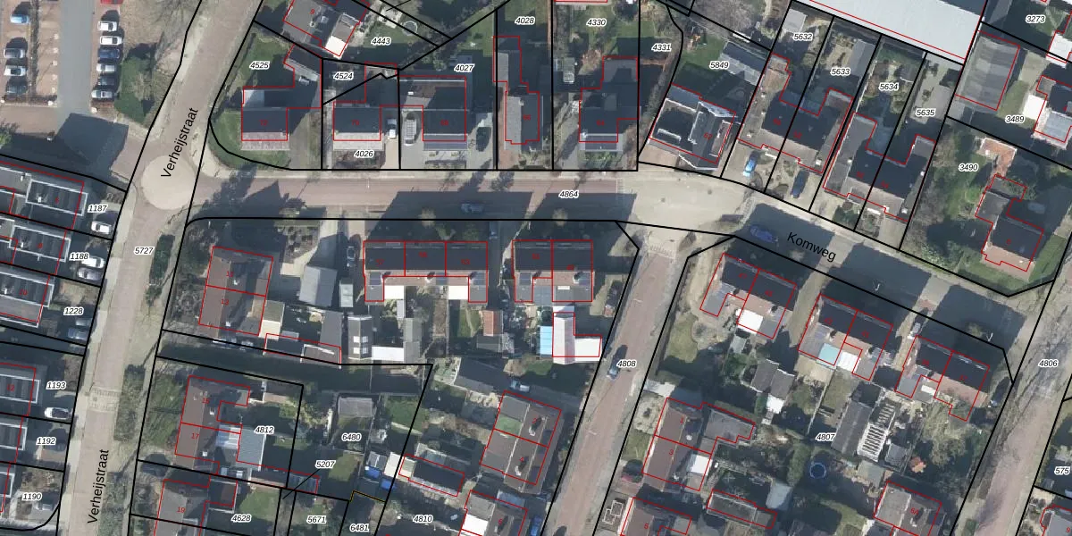 Het perceel waarop Komweg 51 staat heeft een oppervlakte van 5215 m². Dit is een zeer groot perceel. De perceeloppervlakte wordt geregistreerd door het Kadaster. Gedetailleerde informatie over de maten van dit perceel kunt u vinden in het rapport Kadastrale kaart met maatvoering van Komweg 51.