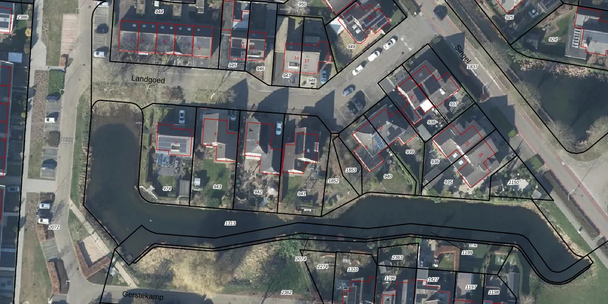 Het perceel waarop Landgoed 8 staat heeft een oppervlakte van 485 m². Dit is een groot perceel. De perceeloppervlakte wordt geregistreerd door het Kadaster. Gedetailleerde informatie over de maten van dit perceel kunt u vinden in het rapport Kadastrale kaart met maatvoering van Landgoed 8.