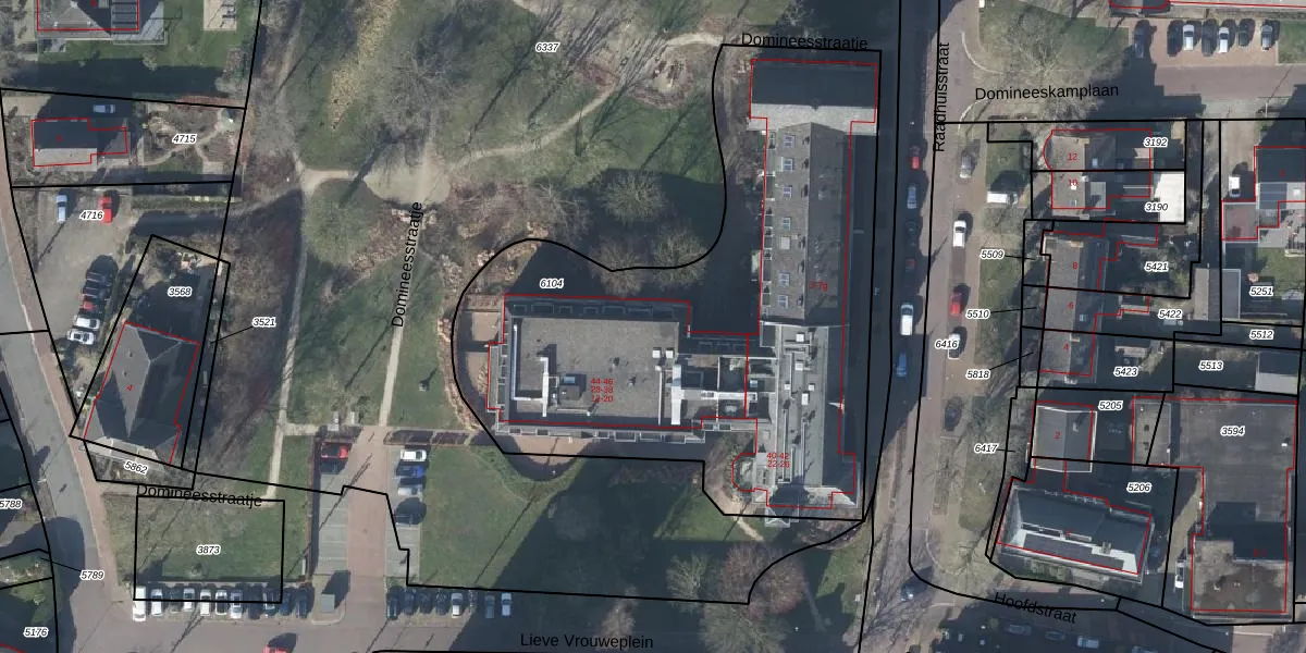 Het perceel waarop Lieve Vrouweplein 20 staat heeft een oppervlakte van 2880 m². Dit is een zeer groot perceel. De perceeloppervlakte wordt geregistreerd door het Kadaster. Gedetailleerde informatie over de maten van dit perceel kunt u vinden in het rapport Kadastrale kaart met maatvoering van Lieve Vrouweplein 20.