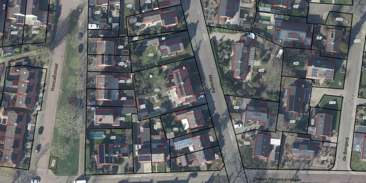Het perceel waarop Marsweg 27 staat heeft een oppervlakte van 975 m². Dit is een groot perceel. De perceeloppervlakte wordt geregistreerd door het Kadaster. Gedetailleerde informatie over de maten van dit perceel kunt u vinden in het rapport Kadastrale kaart met maatvoering van Marsweg 27.