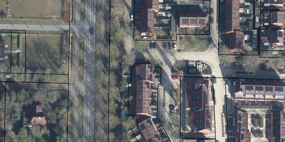 Het perceel waarop Merelstraat 3 staat heeft een oppervlakte van 1260 m². Dit is een zeer groot perceel. De perceeloppervlakte wordt geregistreerd door het Kadaster. Gedetailleerde informatie over de maten van dit perceel kunt u vinden in het rapport Kadastrale kaart met maatvoering van Merelstraat 3.