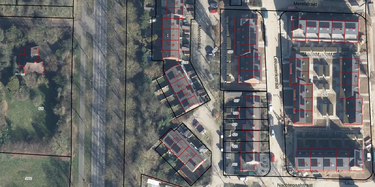 Het perceel waarop Merelstraat 33 staat heeft een oppervlakte van 1260 m². Dit is een zeer groot perceel. De perceeloppervlakte wordt geregistreerd door het Kadaster. Gedetailleerde informatie over de maten van dit perceel kunt u vinden in het rapport Kadastrale kaart met maatvoering van Merelstraat 33.