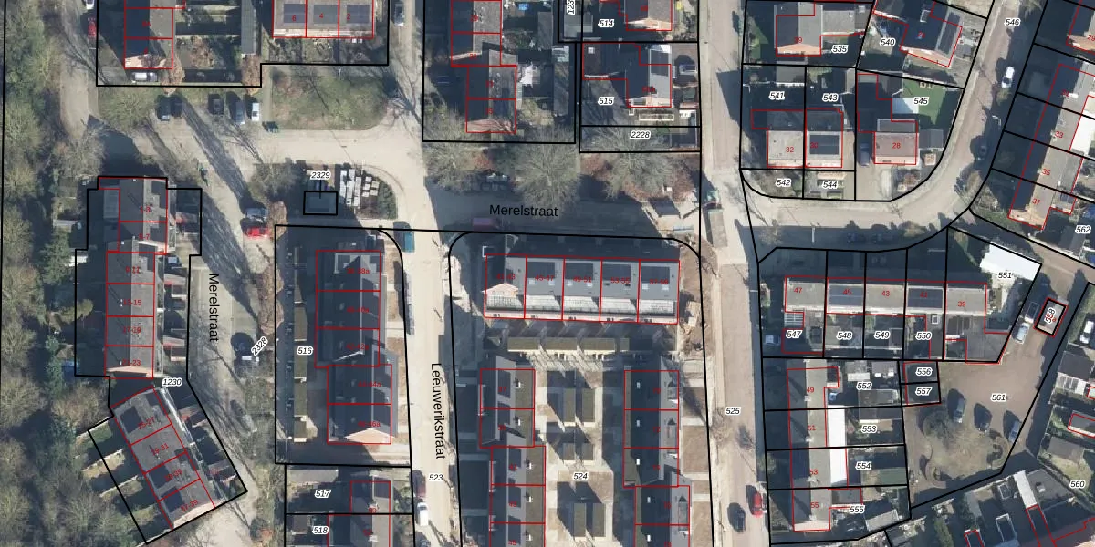 Het perceel waarop Merelstraat 45 staat heeft een oppervlakte van 4065 m². Dit is een zeer groot perceel. De perceeloppervlakte wordt geregistreerd door het Kadaster. Gedetailleerde informatie over de maten van dit perceel kunt u vinden in het rapport Kadastrale kaart met maatvoering van Merelstraat 45.