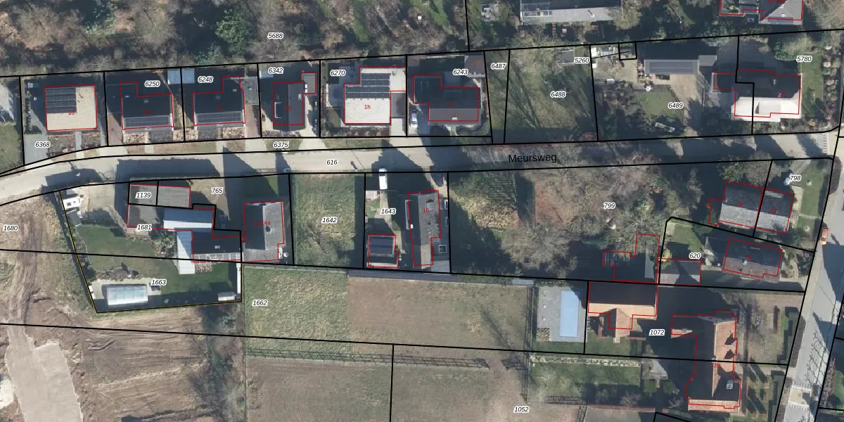 Meursweg 16 is gelegen op kadastraal perceel DDM00N1643. Deze kadastrale aanduiding is uniek en wordt gebruikt door het Kadaster om eigendomsrechten en andere zakelijke rechten vast te leggen. Het perceel maakt onderdeel uit van de kadastrale gemeente Didam.