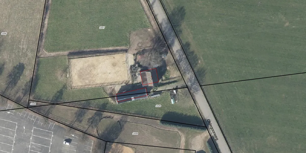 Oldegoorweg 1 is gelegen op kadastraal perceel DDM00O1647. Deze kadastrale aanduiding is uniek en wordt gebruikt door het Kadaster om eigendomsrechten en andere zakelijke rechten vast te leggen. Het perceel maakt onderdeel uit van de kadastrale gemeente Didam.