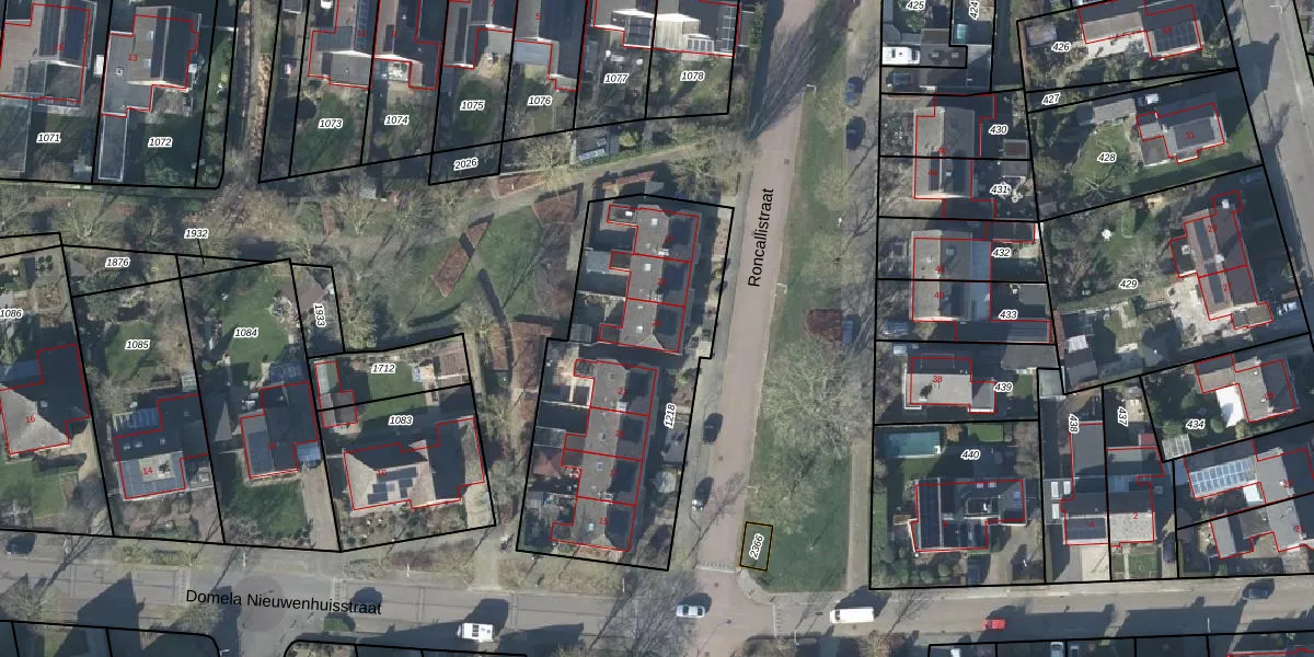Het perceel waarop Roncallistraat 23 staat heeft een oppervlakte van 1256 m². Dit is een zeer groot perceel. De perceeloppervlakte wordt geregistreerd door het Kadaster. Gedetailleerde informatie over de maten van dit perceel kunt u vinden in het rapport Kadastrale kaart met maatvoering van Roncallistraat 23.
