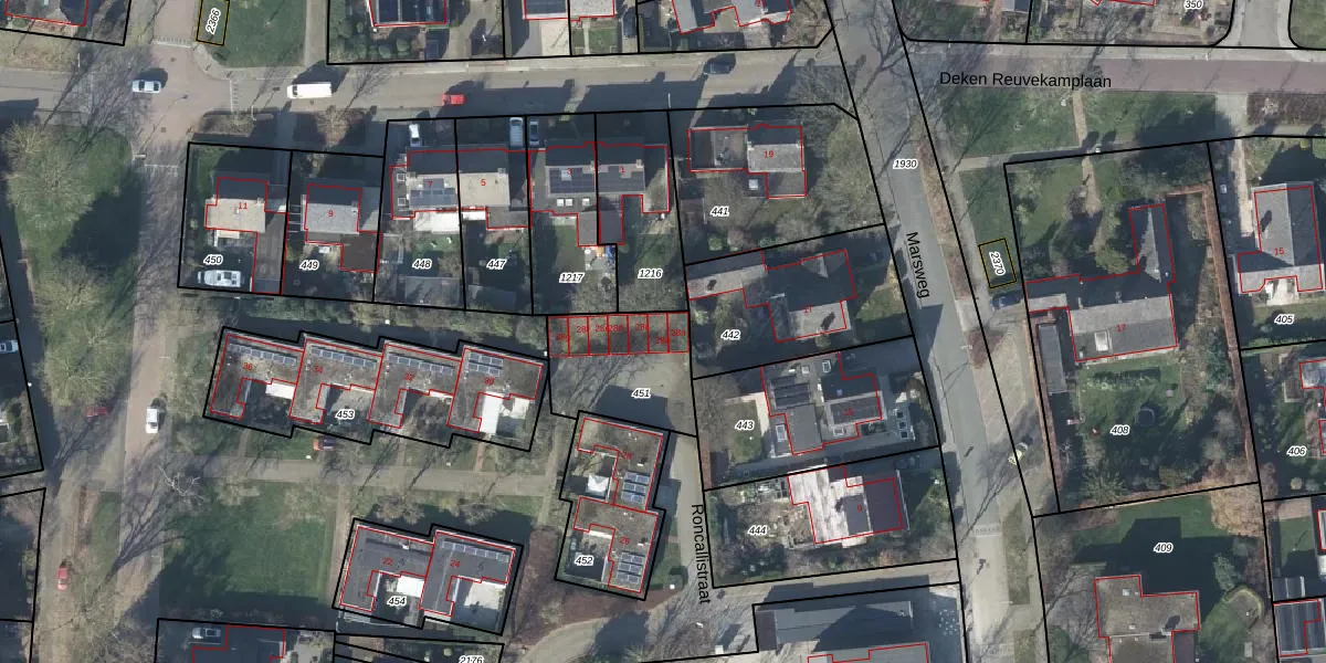Het perceel waarop Roncallistraat 28-b staat heeft een oppervlakte van 360 m². Dit is een groot perceel. De perceeloppervlakte wordt geregistreerd door het Kadaster. Gedetailleerde informatie over de maten van dit perceel kunt u vinden in het rapport Kadastrale kaart met maatvoering van Roncallistraat 28-b.