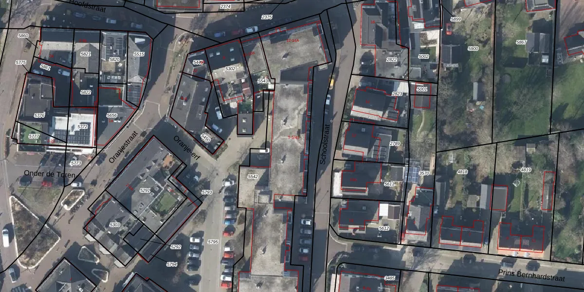 Het perceel waarop Schoolstraat 5-20 staat heeft een oppervlakte van 1845 m². Dit is een zeer groot perceel. De perceeloppervlakte wordt geregistreerd door het Kadaster. Gedetailleerde informatie over de maten van dit perceel kunt u vinden in het rapport Kadastrale kaart met maatvoering van Schoolstraat 5-20.