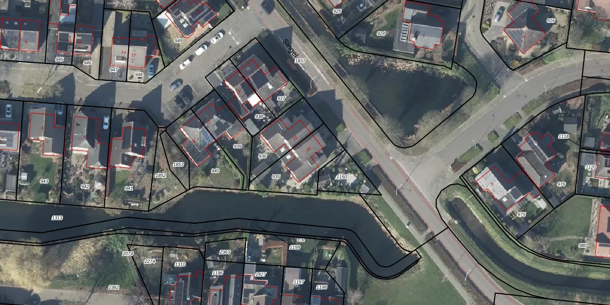 Het perceel waarop Singel 24 staat heeft een oppervlakte van 350 m². Dit is een groot perceel. De perceeloppervlakte wordt geregistreerd door het Kadaster. Gedetailleerde informatie over de maten van dit perceel kunt u vinden in het rapport Kadastrale kaart met maatvoering van Singel 24.