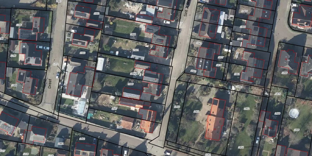 Sint Josephstraat 9 is gelegen op kadastraal perceel DDM00L1445. Deze kadastrale aanduiding is uniek en wordt gebruikt door het Kadaster om eigendomsrechten en andere zakelijke rechten vast te leggen. Het perceel maakt onderdeel uit van de kadastrale gemeente Didam.