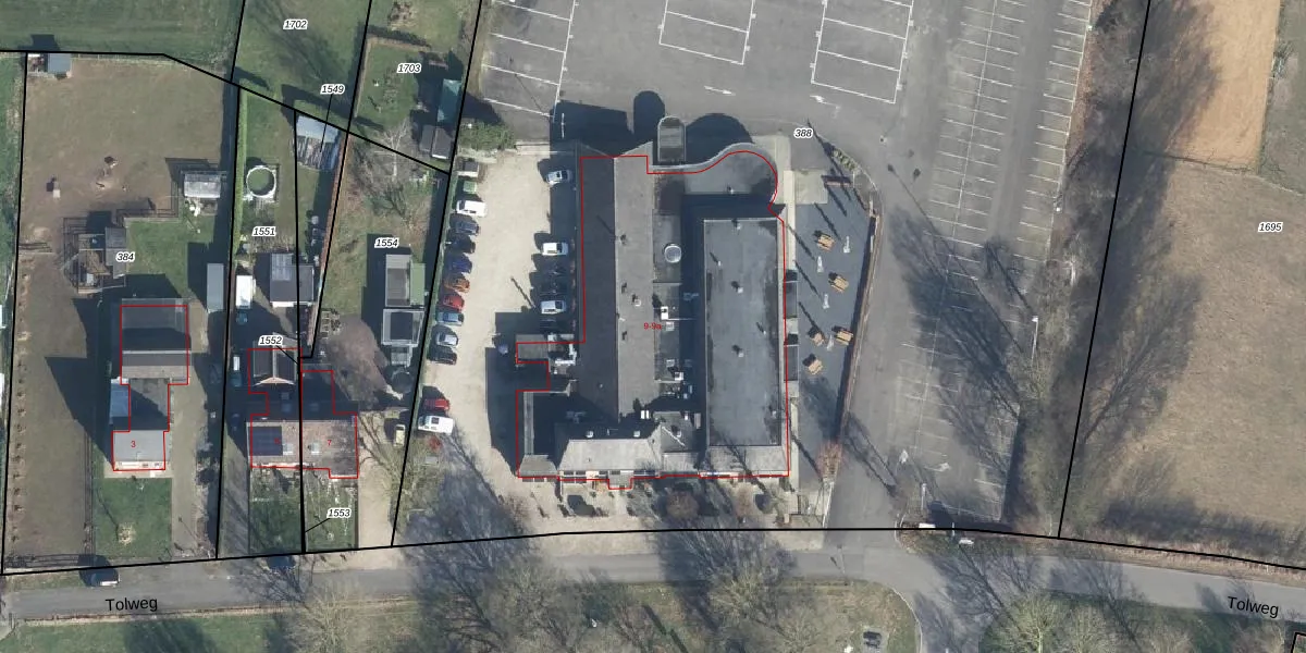 Tolweg 9 is gelegen op kadastraal perceel DDM00O388. Deze kadastrale aanduiding is uniek en wordt gebruikt door het Kadaster om eigendomsrechten en andere zakelijke rechten vast te leggen. Het perceel maakt onderdeel uit van de kadastrale gemeente Didam.