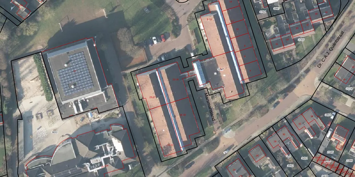 Het perceel waarop Marsmansland 22 staat heeft een oppervlakte van 3310 m². Dit is een zeer groot perceel. De perceeloppervlakte wordt geregistreerd door het Kadaster. Gedetailleerde informatie over de maten van dit perceel kunt u vinden in het rapport Kadastrale kaart met maatvoering van Marsmansland 22.